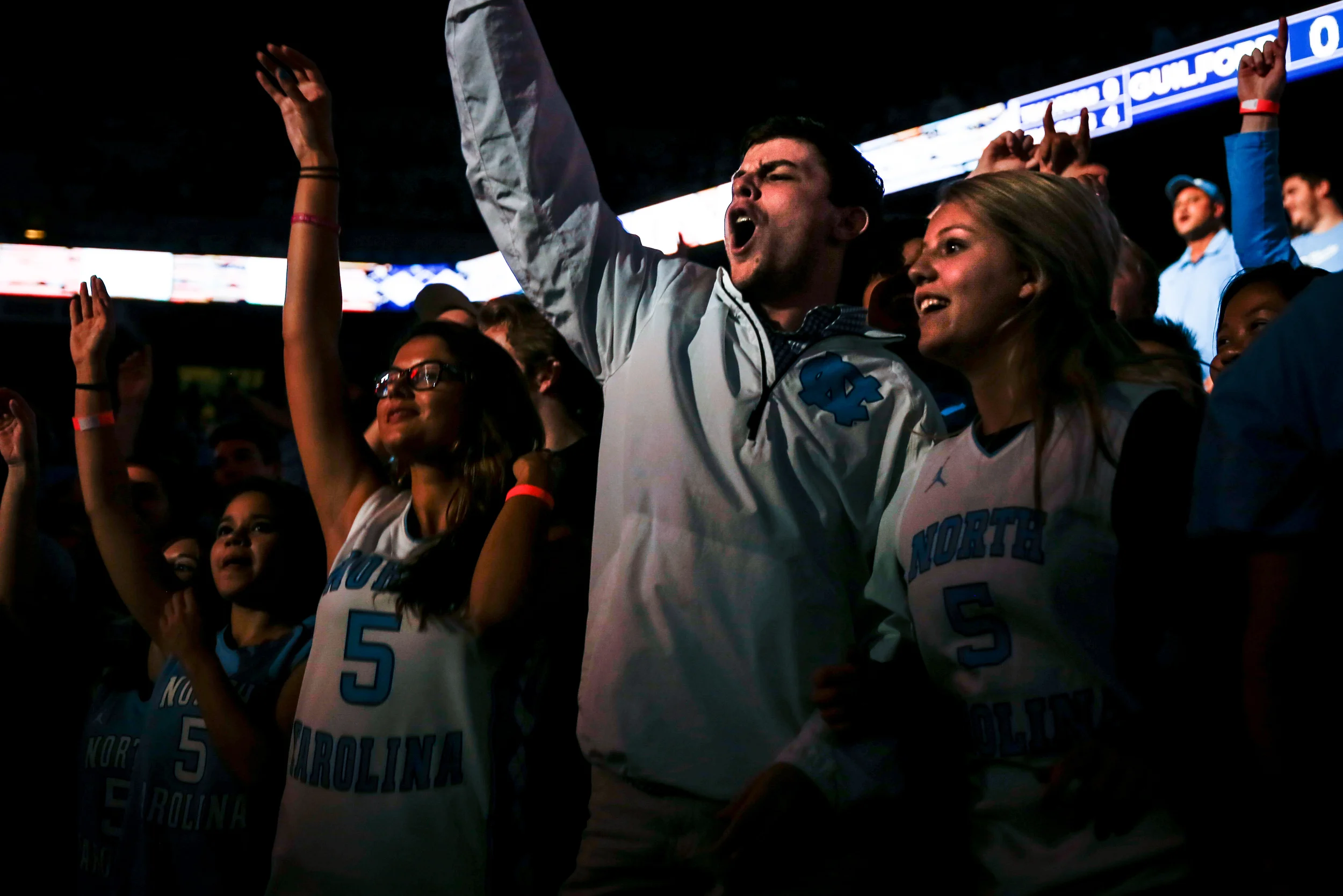 UNC fans cheer during the North Carolina team intoductions before their season's opening exhibition basketball game at the Dean Smith Center on Friday, Nov. 6, 2015. UNC defeated Guilford 99-49.
