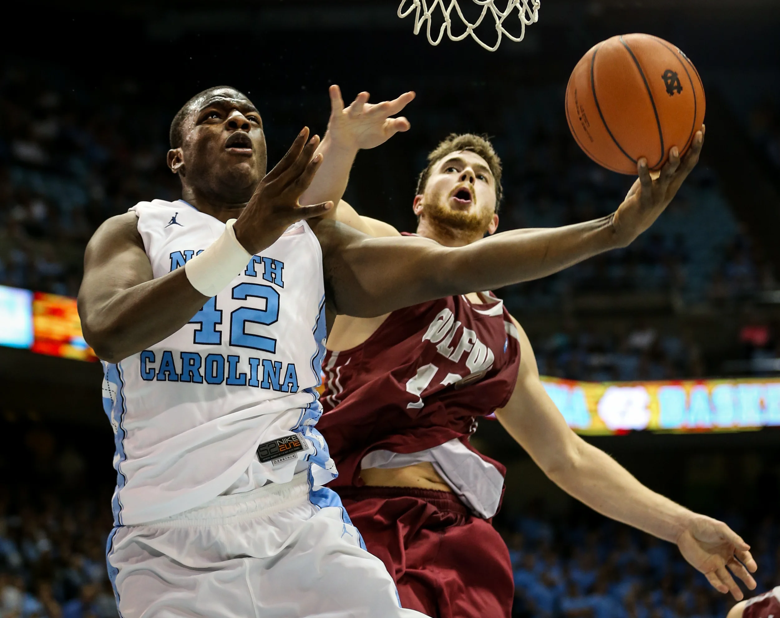 Joel James of the North Carolina Tarheels goes up for a layup as Will Freeman of Guilford attempts to block the shot during the men's preseason exhibition game at the Dean Smith Center on Friday, Nov. 6, 2015. UNC defeated Guilford 99-49.