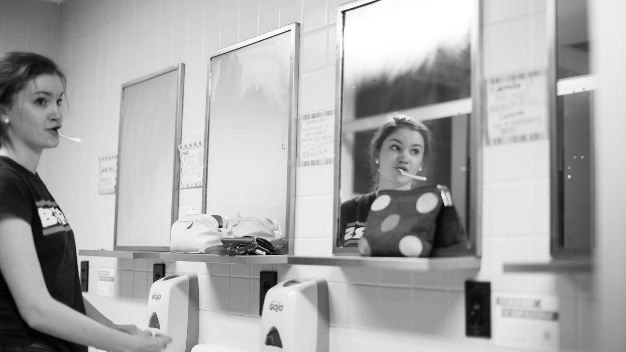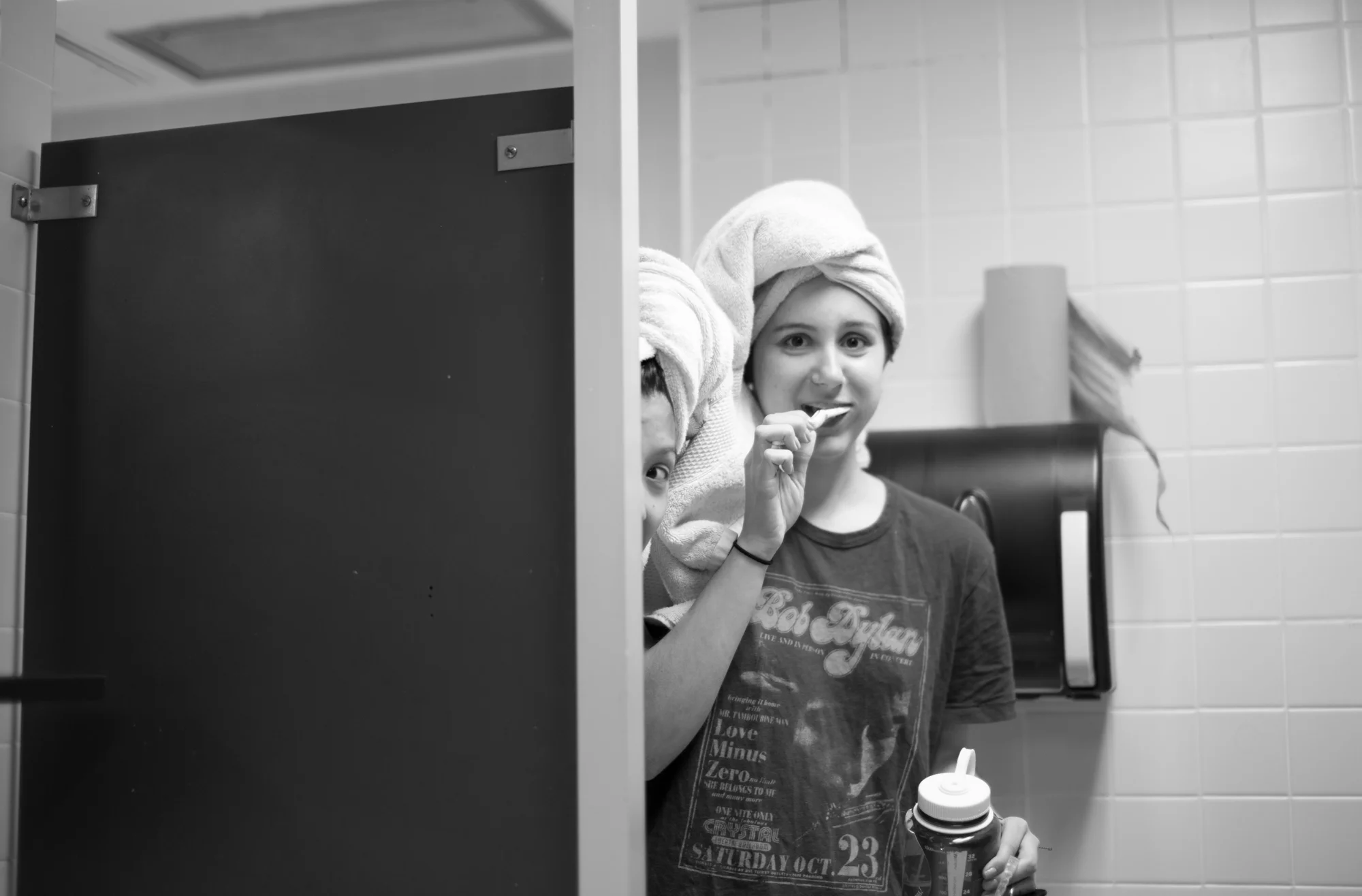 From left to right, Emily Bui and Emma Zisek cautiously walk into the dorm bathroom to prepare for bed. "Wait, why is there a tripod in here?" Zisek said as Bui peeks around the corner.