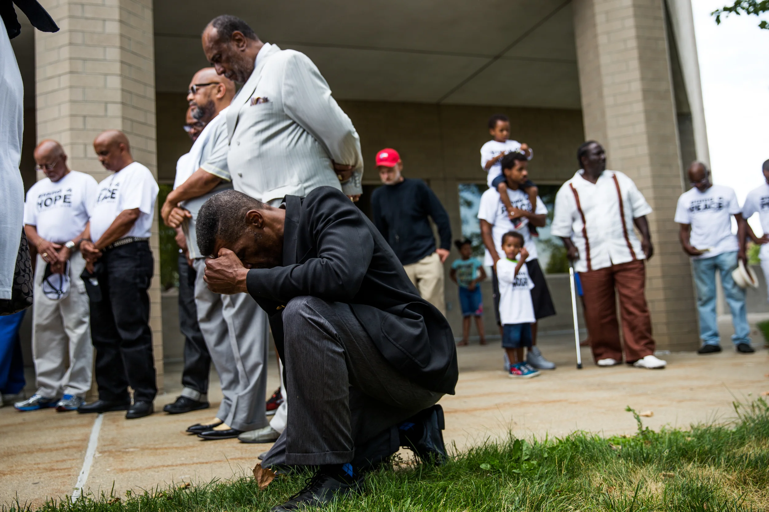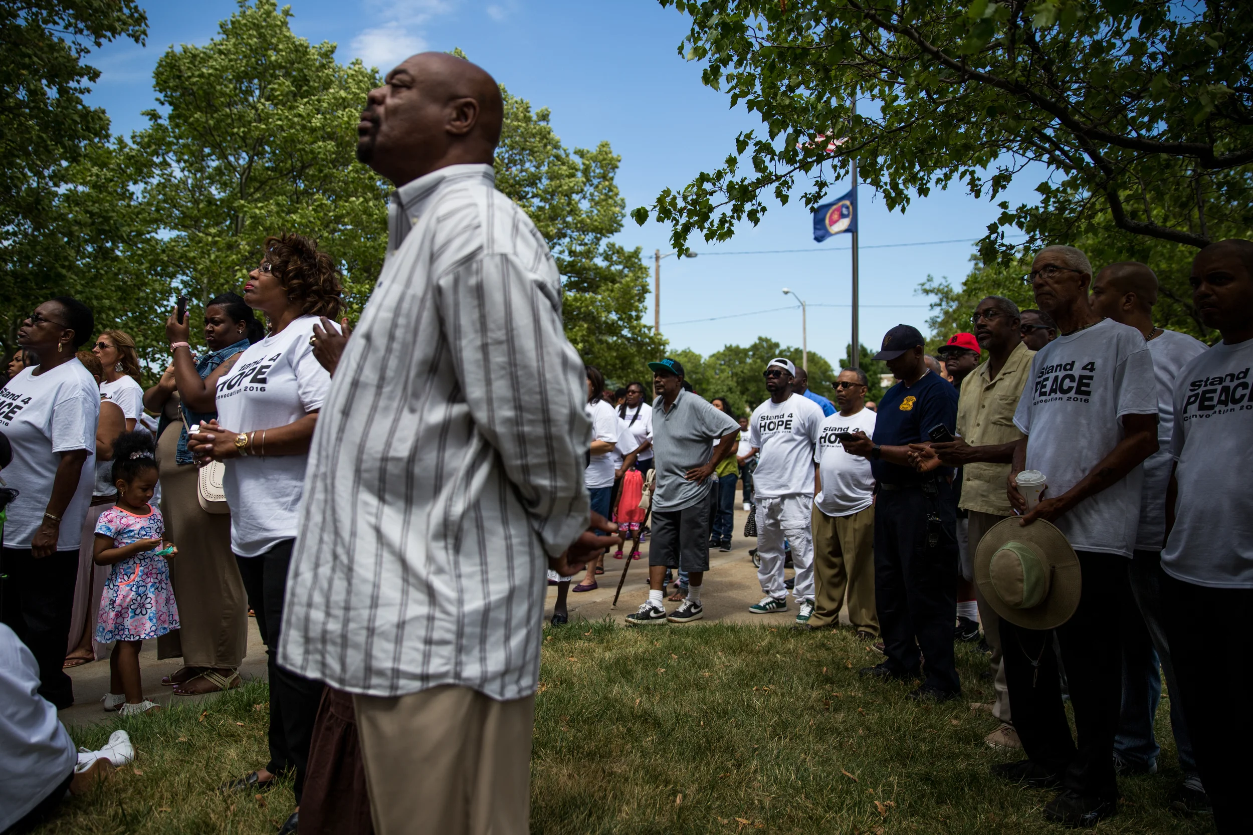 The community of Flint gathers with law enforcement officers outside the Genesee County Jail during a protest organized by Ebenezer Ministries on Sunday, July 17, 2016 in downtown Flint. The protest promoted unity and respect between the community a…