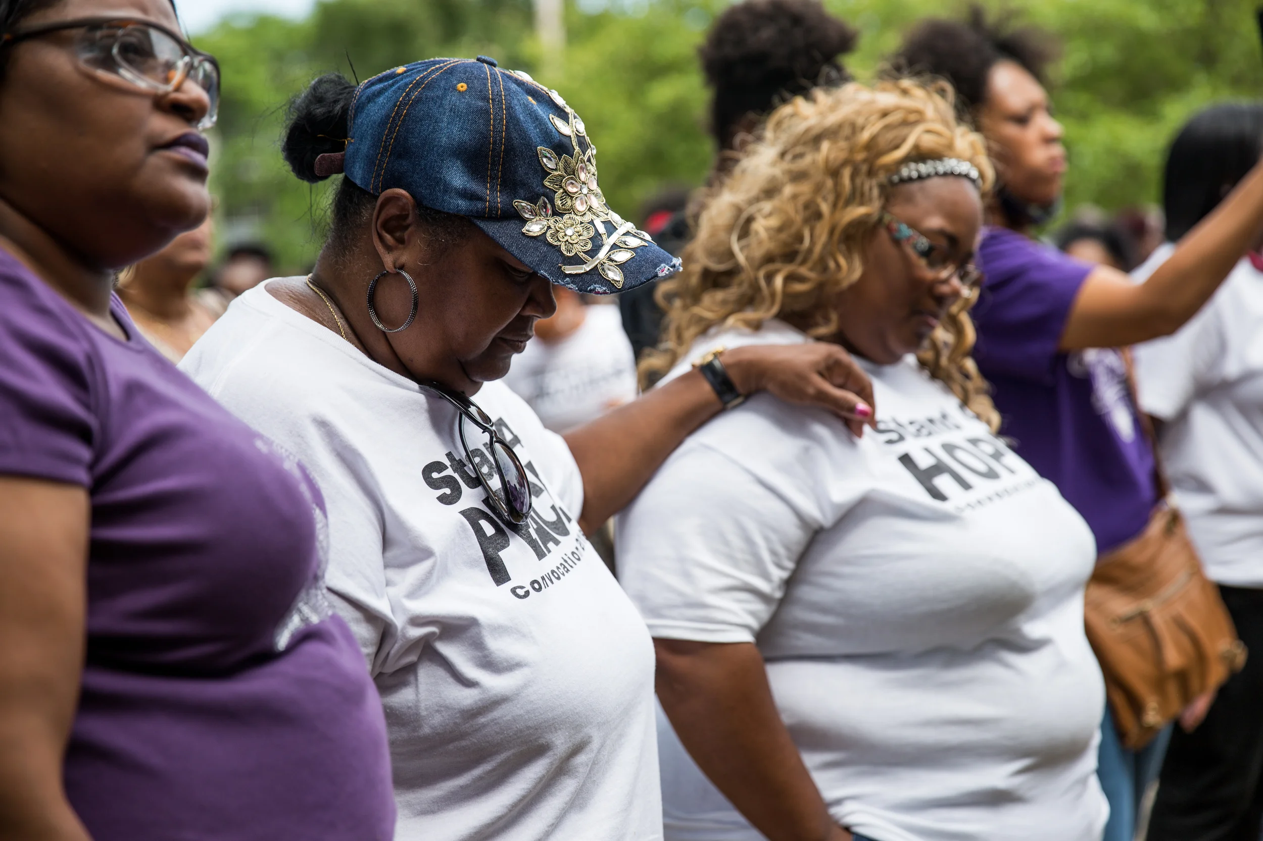 The community of Flint gathers with law enforcement officers outside the Genesee County Jail during a protest organized by Ebenezer Ministries on Sunday, July 17, 2016 in downtown Flint. The protest promoted unity and respect between the community and law enforcement officers after the Baton Rouge shooting that left three police officers dead.